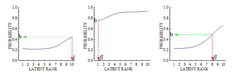 the location of the latent rank when the IRP value is closest to 0.5, and b is